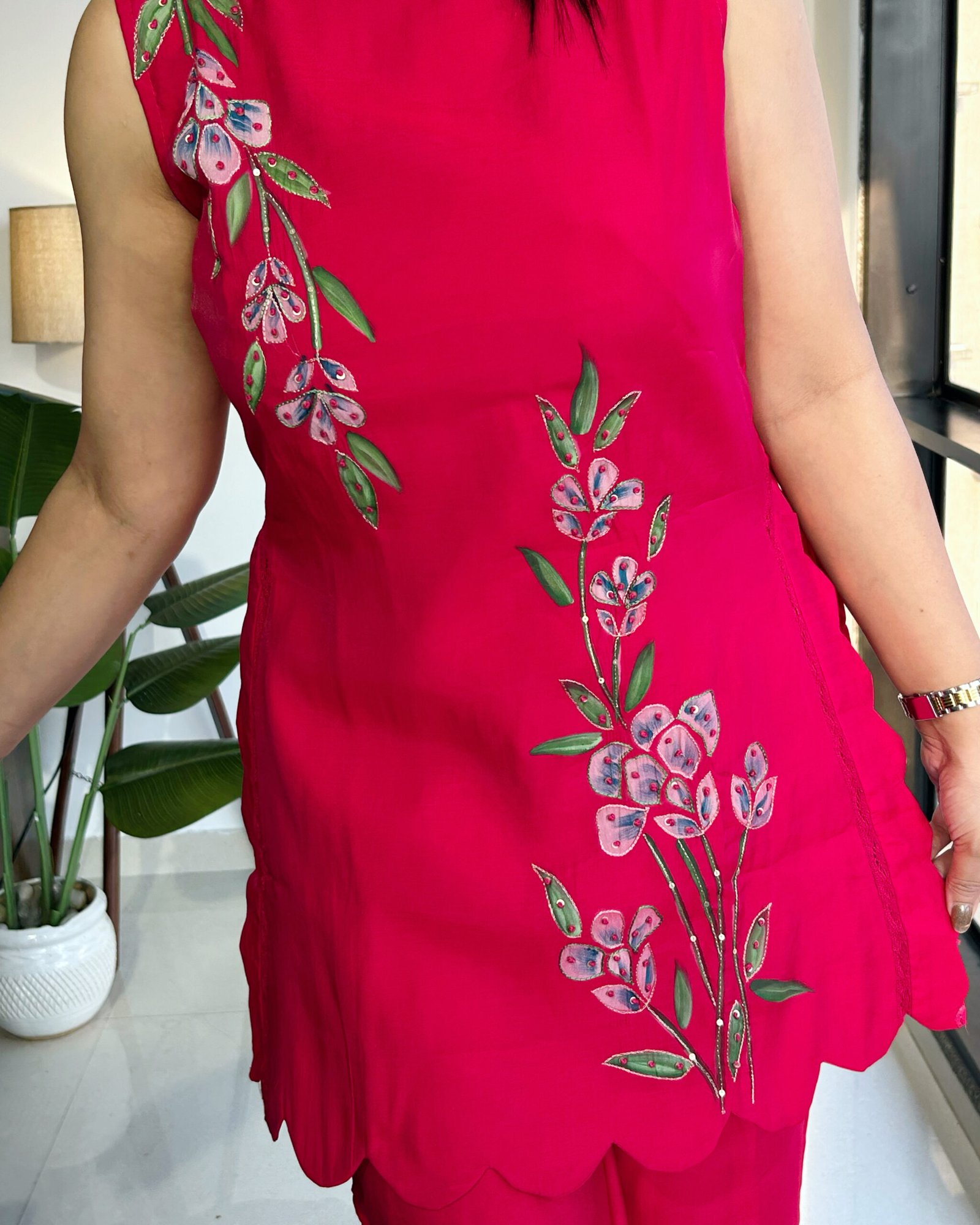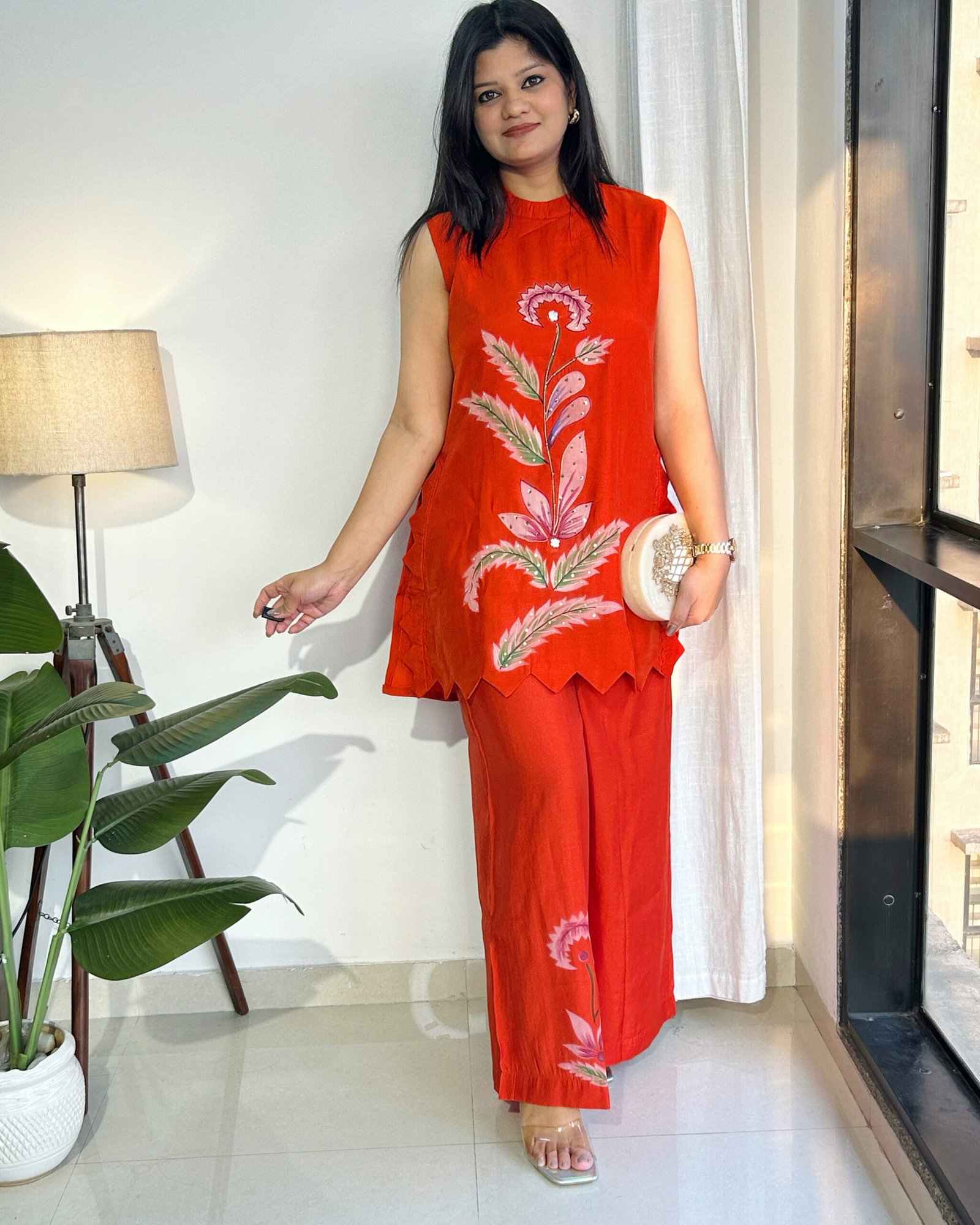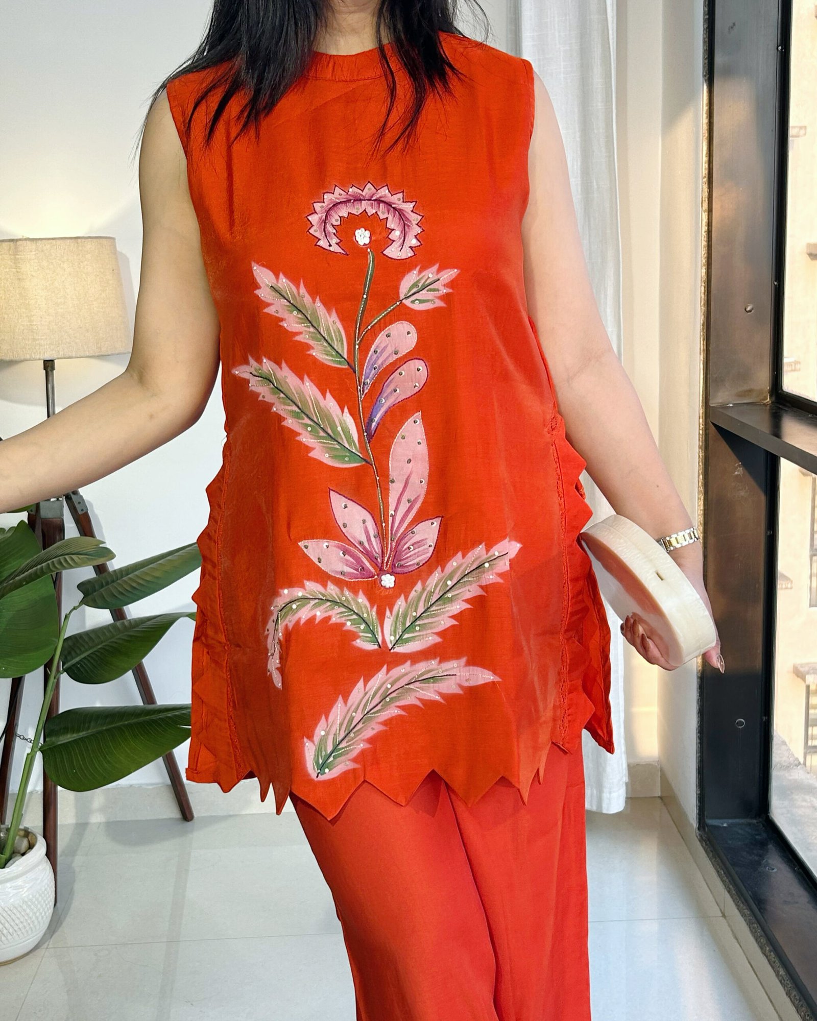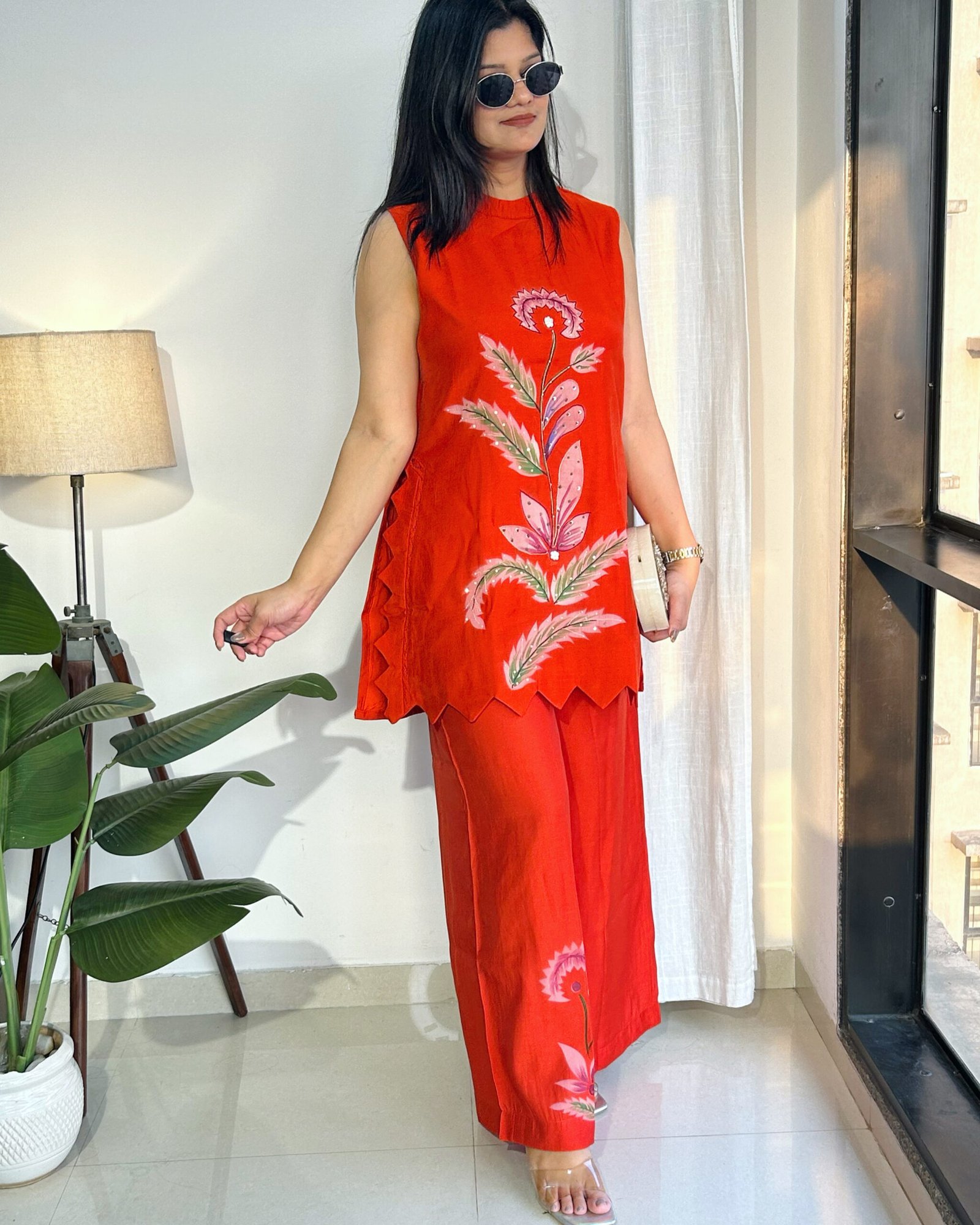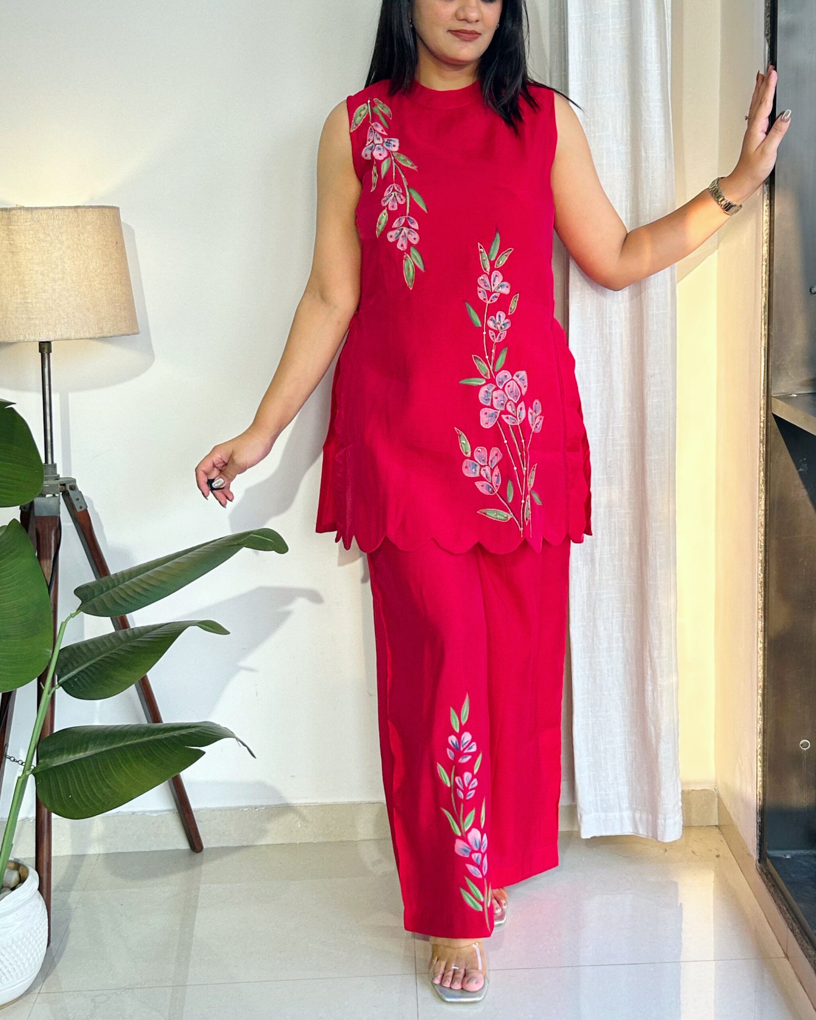 This gorgeous party-ready cord set is crafted in the softest Malchandari fabric—so light, so comfortable, you’ll forget you’re all dressed up. Adorned with delicate hand painting, intricate handwork highlights, and finished with beautiful cutwork detailing, every inch feels special.